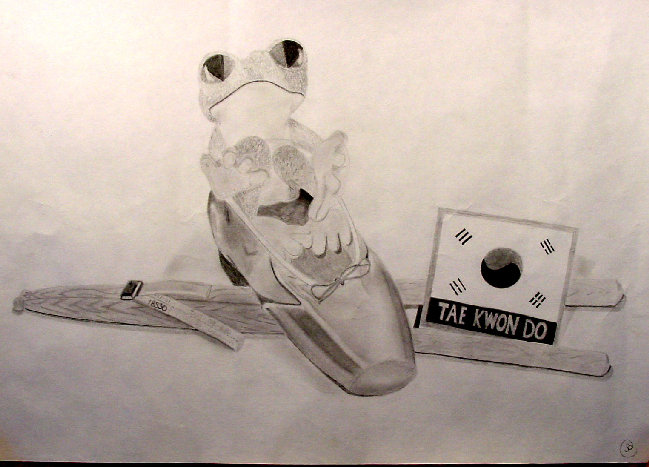 One of Brie's art projects depicting some of her favorite things: frogs, dance, drums, Tae Kwon Do, and Tori's birth bracelet.